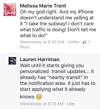 Once Siri has her epiphany, applying the data is pretty easy. The notification center already shows “nearby transit”, so clearly Siri knows that information already. So if she’d get off her butt, she’d say “Hey instead of telling you that it will take you 15 minutes to get to work because Main St. is unusually heavy right now, I finally noticed that you take the M train, and the M train is coming in 3, 5, and 7 minutes.”