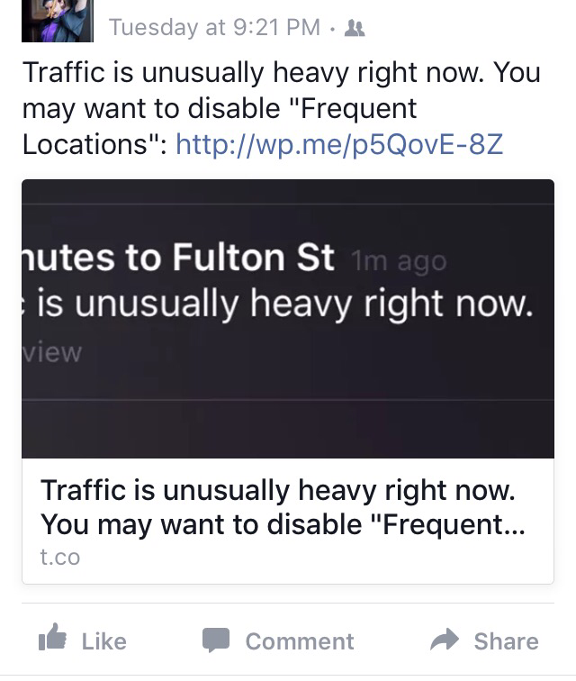 When I posted a link to my latest blog piece,Β Traffic is unusually heavy right now. You may want to disable “Frequent Locations” to my Facebook page, a fantastically hilarious comment stream ensued. (Don’t worry, I got Ms. Melissa Trent’s consent before posting this).