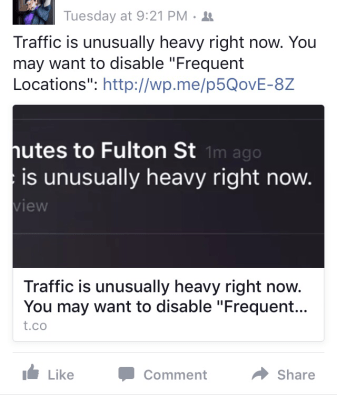 Note that, given iOS’s Frequent Locations feature that’s heavily discussed in the aforementioned blog post, there’s absolutely no reason Siri or iOS or “who”ever we want to blameΒ (sorry guys, I’m just going to blame Siri) can’t automatically shift to giving you transit or even walking updates.